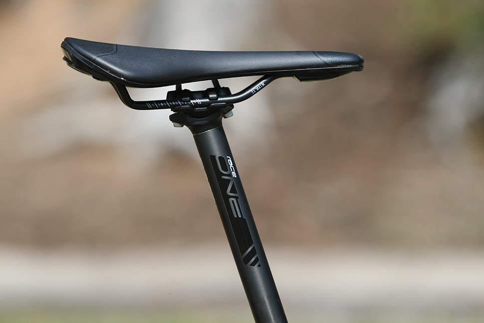 Oproti tomu sedlovka je zde karbonová s hliníkovým zámkem a zakončená je Fízik sedlem Taiga s ocelovými ližinami.