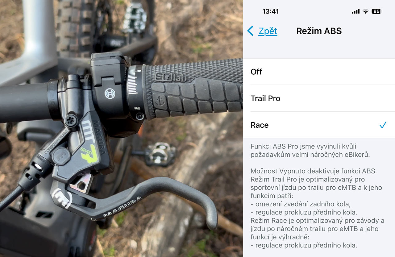 Nový systém ABS nabízí v rámci aplikace tři režimy. Reálně jde o dva – základní Trail Pro a pokročilý Race režim. Ty se sice chovají trochu odlišně, ale ne dramaticky. Mně osobně jednoznačně sedl režim Race, o kterém píšu výše. Přepínat mezi režimy můžete buď pomocí displeje (pokud ho máte), nebo jednoduše v mobilní aplikaci.