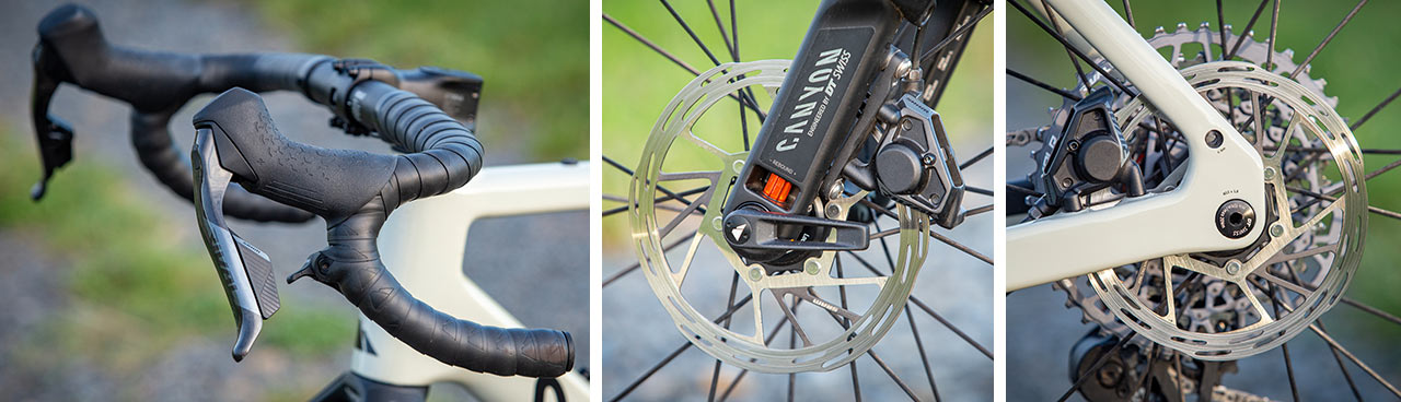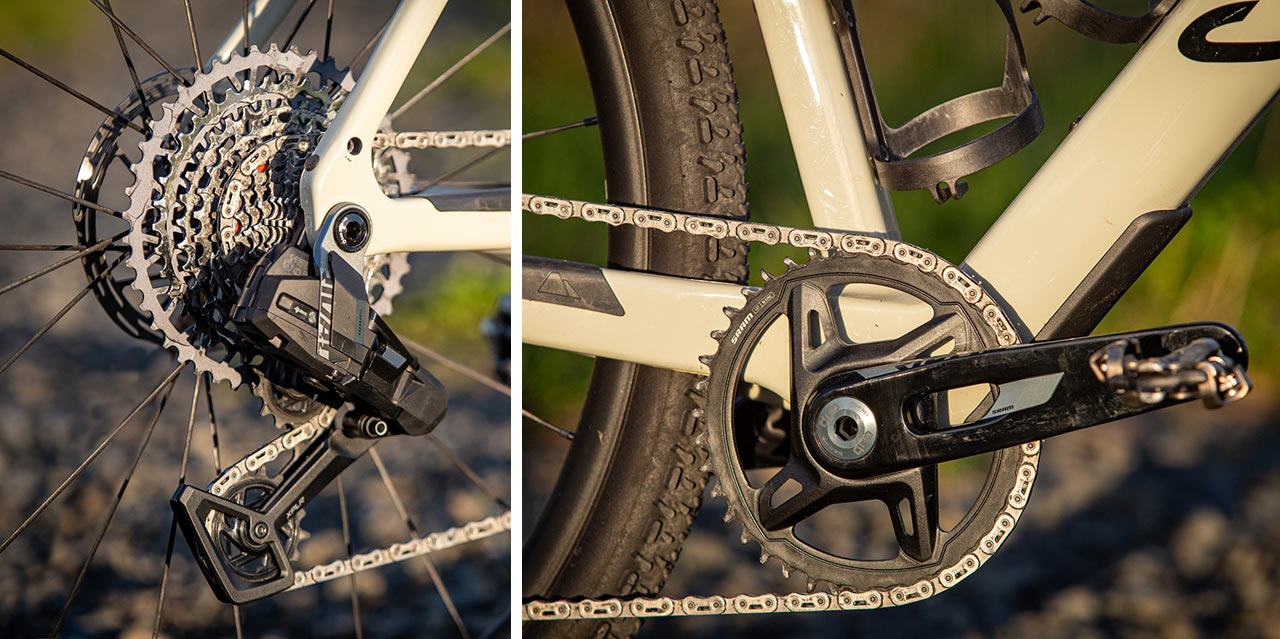 Při pohledu na výbavu testovaného modelu zaplesá srdce nejednoho moderního štěrkoletce. Pohon zde dostal na starost kompletní Sram a to v rámci nejnovější XPLR řady Rival s elektronicky ovládanou AXS přehazovačkou a řazením 1x13, které nejen že dostalo nově poskládanou gravelovou kazetu, ale především se může pyšnit novými ergonomickými řadícími a brzdícími pákami. Ty nejen že skvěle padnou do ruky, ale především se jimi daleko jistěji brzdí v rámci horního úchopu.