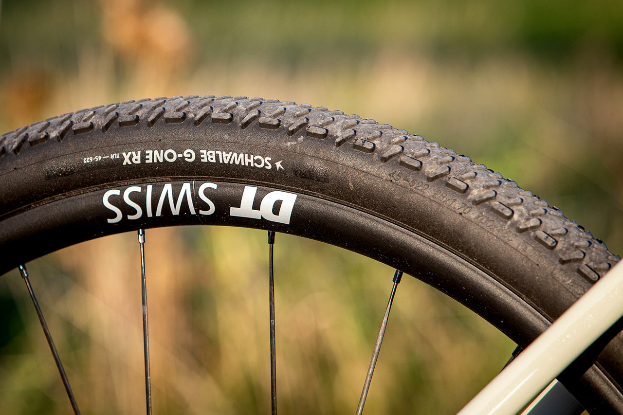 Zapletená kola jsou zde hliníková v gravelové specifikaci DT Swiss G1800 Spline s vnitřní šířkou 24 mm a výškou pouhých 25 mm, která jsou obutá do Schwalbe G-One RX Performance plášťů o šířce 45 mm. Canyon v tomto případě uvádí, že rám je připravený pro 54 mm široké pláště, zatímco vidlice zkousne maximálně 50 mm. Rezerva na ještě objemnější obutí než to sériově osazené, je ještě poměrně velká.