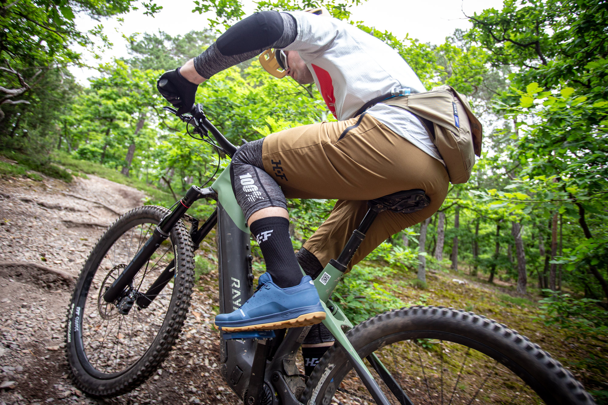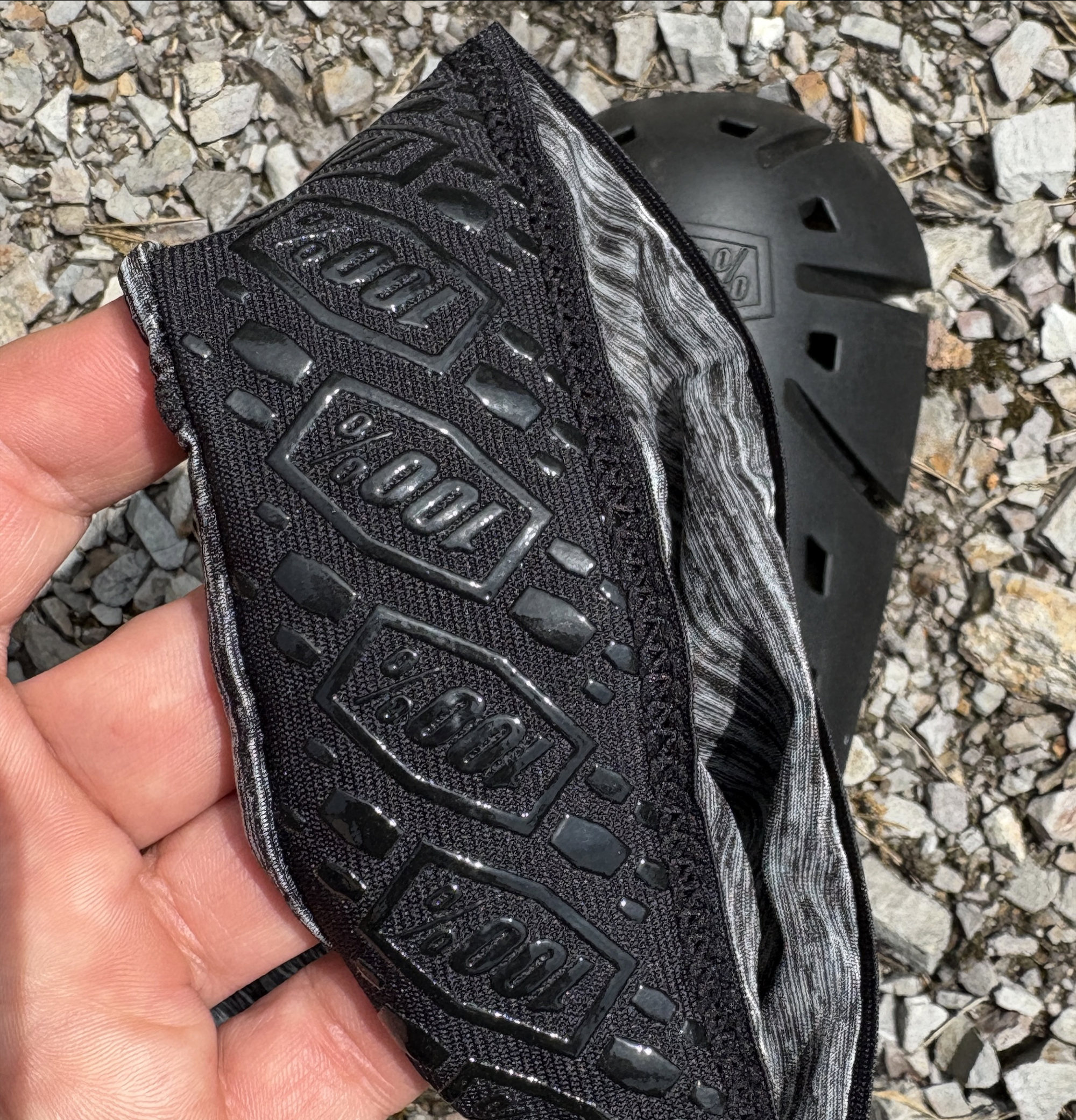 Co mi hned při první praktické zkušenosti sedlo, byl účelně a přirozeně fungující střih s jednoduchou nosnou nohavicí, s odolnější látkou v místě usazení tlumící výplně, ale také s přiměřeně pevnými lemy na obou koncích, které se starají o jisté a spolehlivé usazení na těle. Chrániče 100% Teratec v tomto směru nabízí tradiční spodní lem s natištěným silikonovým páskem, a vyšší horní lem, kde je protiskluzová vrstva řešena pestrým potiskem za využití loga 100%.