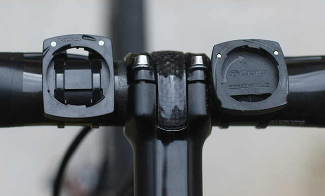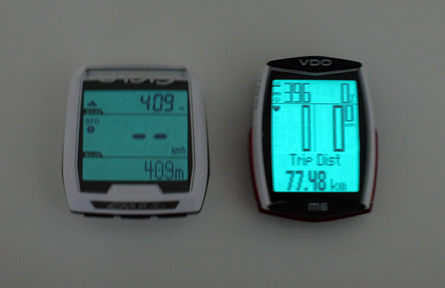 Abychom mohli být co možná nejobjektivnější, dali jsme si oba computery vedle sebe na řídítka a hned v první řadě tak prověřili spolehlivost dvou vedle sebe umístěných digitálních přijímačů a vysílačů. Spárování proběhlo bez jediného problému. Oba přístroje vždy několik sekund po zotavení ze spánkového režimu hledají své vysílače, na což VDO upozorňuje blikáním prostředních číslic, zatímco Ciclosport zobrazuje na svém spodním řádku hlášku "Searching". Po chvilce pak naskočí nuly, resp. údaj o rychlosti a oba computery se rozmakají.