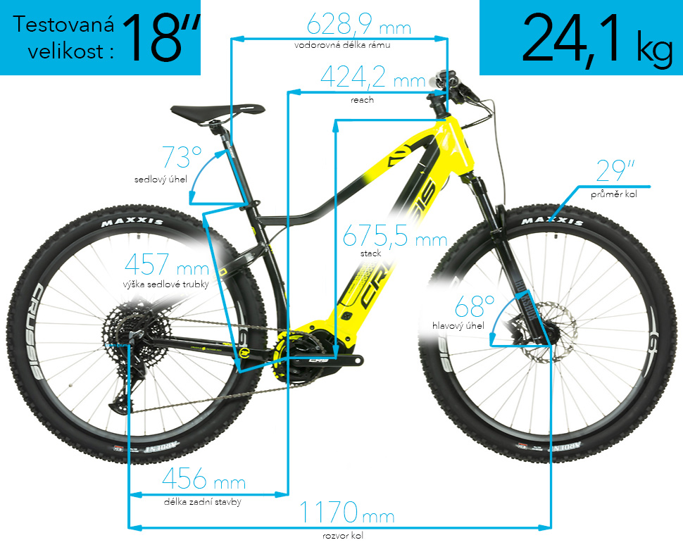 Testovaný bike jsme měli k dispozici ve velikosti 18" který s testovanou 720 Wh baterií vážil bez pedálů 24,1 kg.