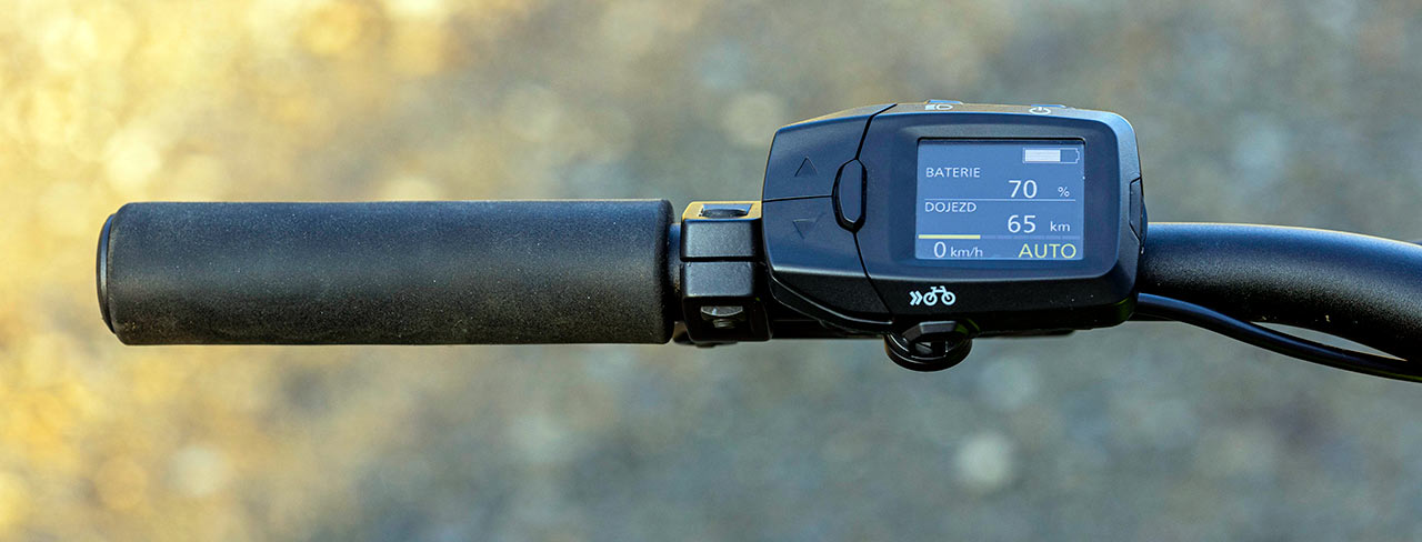 Když už jsme u ovladače, pojďme se na něj podívat blíže. Po zapnutí vás mile překvapí hned několik věcí. Displej je barevný, dobře čitelný a v češtině! Tlačítka na displeji jsou klasická, tedy + a – pro volbu režimu dopomoci motoru, tlačítko asistenta chůze pro pomoc při tlačení kola, přepínání funkcí tachometru a tlačítko ON/OFF pro zapnutí či vypnutí ovladače.