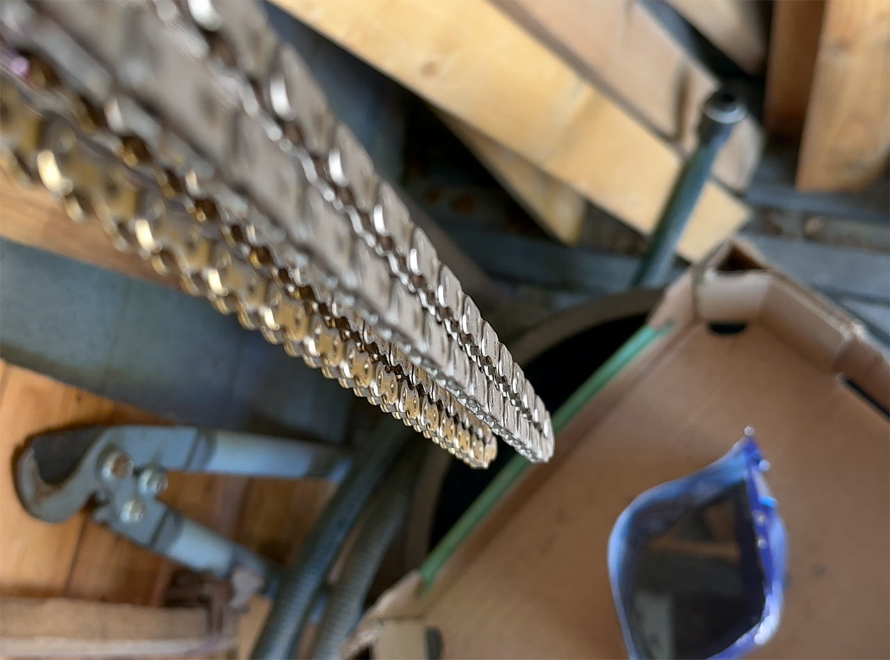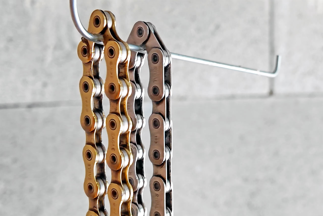 Vždycky když jsem viděl aplikace vosků různými kapátky, říkal jsem si v duchu: jak tímto asi tak chcete dostat vosk opravdu do samotných čepů řetězu? V případě takto kompletní voskové lázně už jsem zdaleka tak výrobce nepodezíral, že se mi to nepodaří – obzvlášť v případě zlatého řetězu, který už měl něco za sebou, ale stále ještě vykazoval schopnosti bez problému fungovat s kazetou i převodníkem, bez náznaku výrazného propadávání kontrolní měrky. A tak jsem byl zvědavý, zda oproti druhému řetězu, což byl řetěz výrazně mladšího data výroby, bude "zatuhnutí" obou řetězů po aplikaci podobné, nebo se bude nějak lišit. I z tohoto důvodu jsem oba řetězy na pomocný háček zavěsil způsobem jiným, než doporučuje návod, a nechal je prověšené v celé jejich délce.