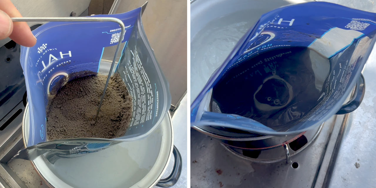 Musím říct, že mě docela překvapilo, jak dlouho trvalo rozehřát celý obsah Finish Line pytlíku s voskem – naivně jsem si myslel, že bude stačit 10 minut varu, ale to jsem se přepočítal. Když cca po půl hodině konečně došlo k úplnému rozehřátí, hrnec jsem sundal na odkládací plochu, vařič vypnul, voda v něm přestala vařit a mohlo se jít na samotnou aplikaci vosku, to jest na koupání řetězů.
