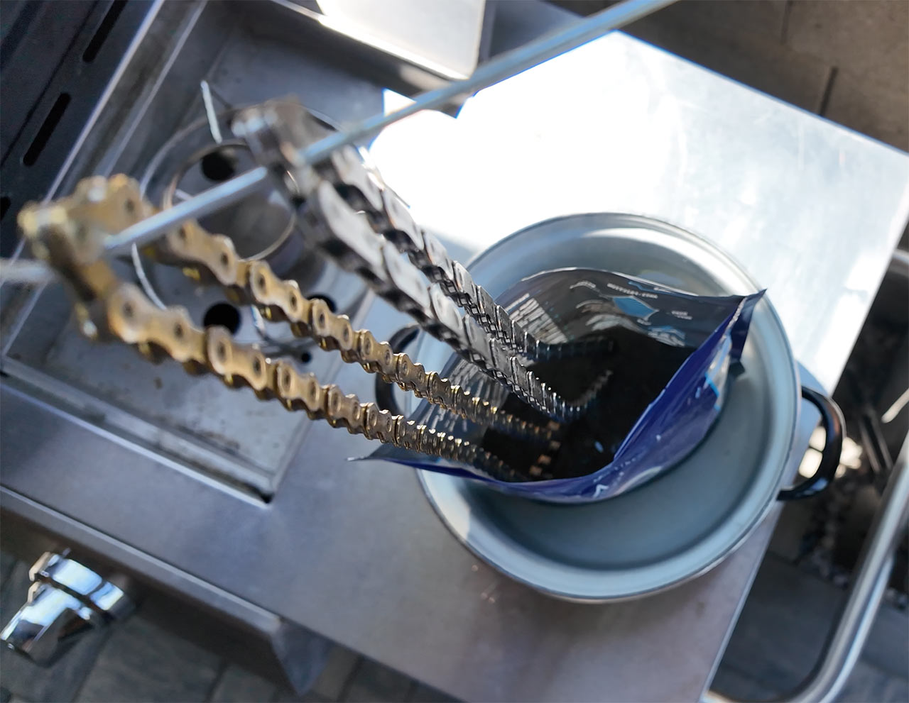 Pro aplikaci vosku touto metodou jsem zvolil dvojici různých i různě starých řetězů a nechal je koupat o pár minut déle, než doporučuje návod. Mimochodem návod hovoří o minimálně 3 minutách, já řetězy nechal louhovat ve vosku necelých 5 minut.