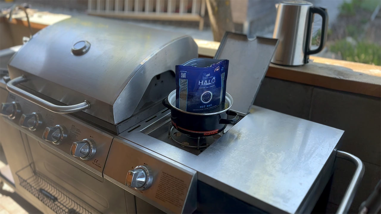 Já jsem pro aplikaci zvolil postarší smaltovaný hrnec, který jsem se rozhodl v rámci minimalizace škod znečištěním zahřívat na našem venkovním plynovém grilu, vybaveném vizionářsky také jednou plynovou plotýnkou, kterou si nejsem vůbec jistý, zda jsem někdy použil. Teď se ale perfektně hodila, protože vedle plotýnky je i nerezová odkládací plocha, což jsem vyhodnotil jako ideální místo pro aplikaci.