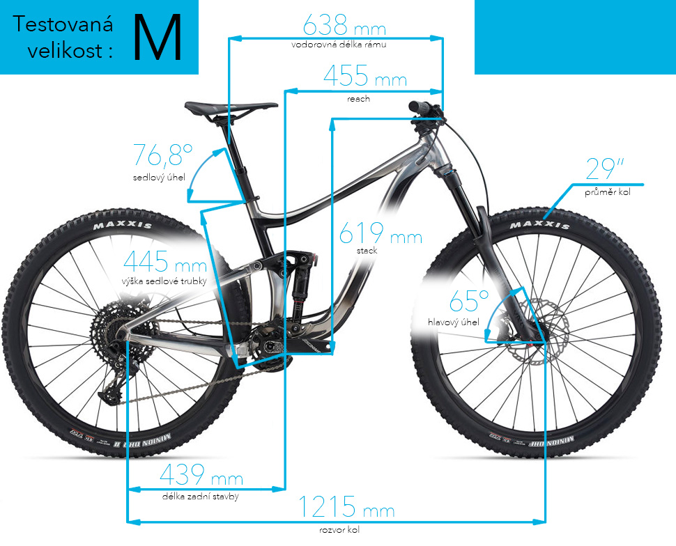 S příchodem velkých kol se i krapet snížil zdvih zadní stavby. Ta nově pracuje se 146 mm zdvihu. Reign byl stvořen pro zdolávání nejtěžších tratí světa a tomu odpovídá i jeho geometrie. Hlavový úhel 65°, sedlový 76,8°, 435 mm dlouhá řetězovka a 455 mm reach v eMku.