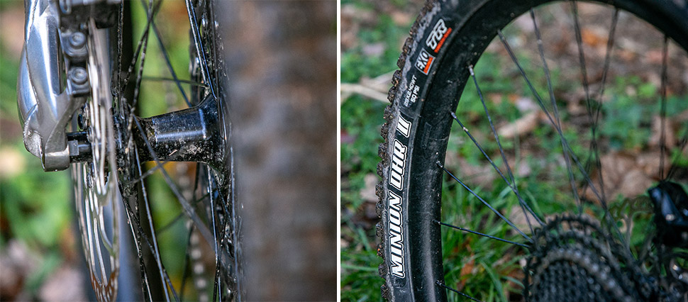 Kabeláž je až k zadní stavbě kompletně vedena vnitřkem rámu. Ta rám opouští ve vrchní části spodní rámové trubky a obepínajíc tlumič pokračuje dál k zadní stavbě a svým cílům. Jak jsem psal výše, zadní stavba se musela přizpůsobit velkému rozměru kol. Aby se tam 29" kolo vešlo, musela vzpěra zadní stavby ustoupit z prostředka na samotný kraj. Zde se najde menší nešvar. Bovden zadní brzdy vede vnitřkem kolem vzpěry zadní stavby a při nazutí 2,6 pláště dochází při pružení ke kontaktu s bowdenem. V našem případě to vyřešila všemocná zdrhovací páska. Takže kluci ještě trochu práce a bude to geniální.