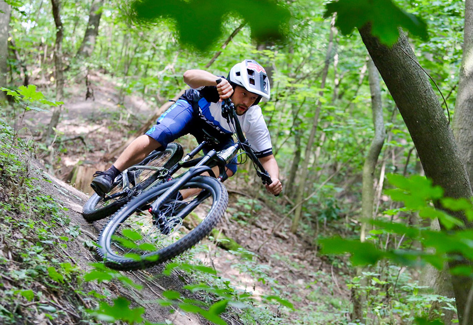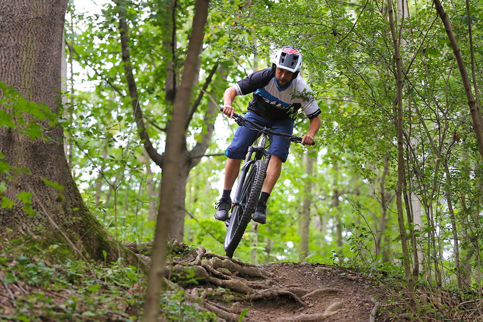 A když už přece jenom došlo ke ztrátě kontaktu předního kola se zemí, bylo lepší slézt, protože se jednalo o stojku, před kterou i Eaglu opadalo peří a mě přešla chuť o sebepoškozování. Přestože se jedná o né zrovna krátké kolo na devětadvacítkách, překvapila mě jeho obratnost mezi kameny a stromy. K tomu dostatek prostoru pro vyrovnávání těžiště a skvěle vyvážená stavba, která dodávala dostatek gripu bez zbytečného pohupování - vkrádaly se mi do hlavy myšlenky o jakési zábavnosti dupání do technického výjezdu. Občasné škrtnutí klik mě ale vždycky naštěstí vrátilo zpět do reality a já zas začal nadávat, kde je ten týpek, co nás odstartuje a pustíme se z kopce…