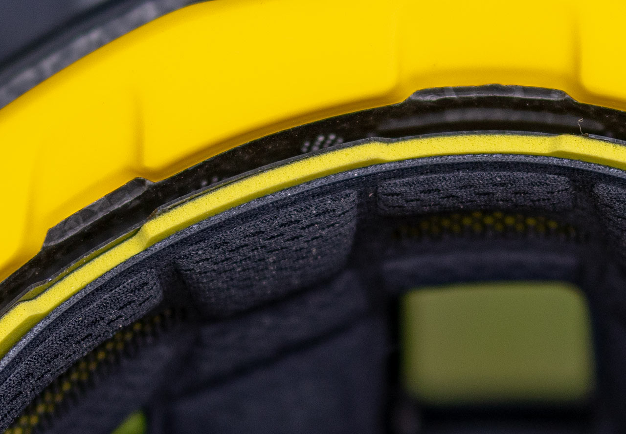 Měkká žlutá paměťová pěna v oblasti čela pomáhá přilbu perfektně usadit – jednak mechanicky, jednak i z hlediska pohodlí. Občas mě některé helmy na čele tlačí kvůli ne příliš dobře tvarovaným čelním vycpávkám, které mám pak ještě dlouho obtisknuty na čele, ale to tady absolutně nehrozí.