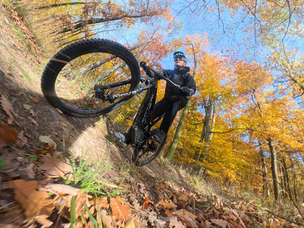 Pocitově je „efstovka“ lépe padnoucím bikem do ruky, co se týká manévrovatelnosti. Přišlo mi, jako bych seděl více mezi koly než nad nimi. Velký vliv na to má určitě hodně nízko umístěná horní rámová trubka, která sice nedává prostor umístit do rámu držák na láhev, (ten tak najdete na vrhu hotní rámovky), ale opticky i prakticky posouvá těžiště celého bajku směrem dolů, což je benefit, který oceníte v okamžiku, kdy s kolem potřebujete zatáčet, pokládat se do klopenek, rychle měnit směr nebo projíždět technicky náročnější pasáže, kde se vám hodí velký prostor pro manévrování koleny nad rámem. Mám rád nízké těžiště, jako mají například Specialized biky, a tady se to blížilo mému ideálu (nízký střed s vyšším úchopem).