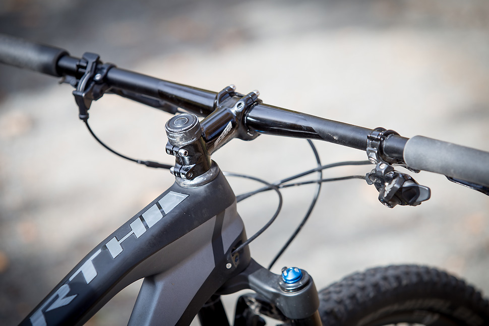 O přesném osazení tohoto testovacího modelu jsme záměrně pomlčeli, protože verze biku, který jsme měli na test, nebyla v úplně 100% shodě s katalogovou výbavou. Pár věcí tu bylo jinak a chyběla bohužel i integrovaná páčka, ovládající současně lockout vidlice a tlumiče, která má lví podíl na univerzalitě tohoto biku.