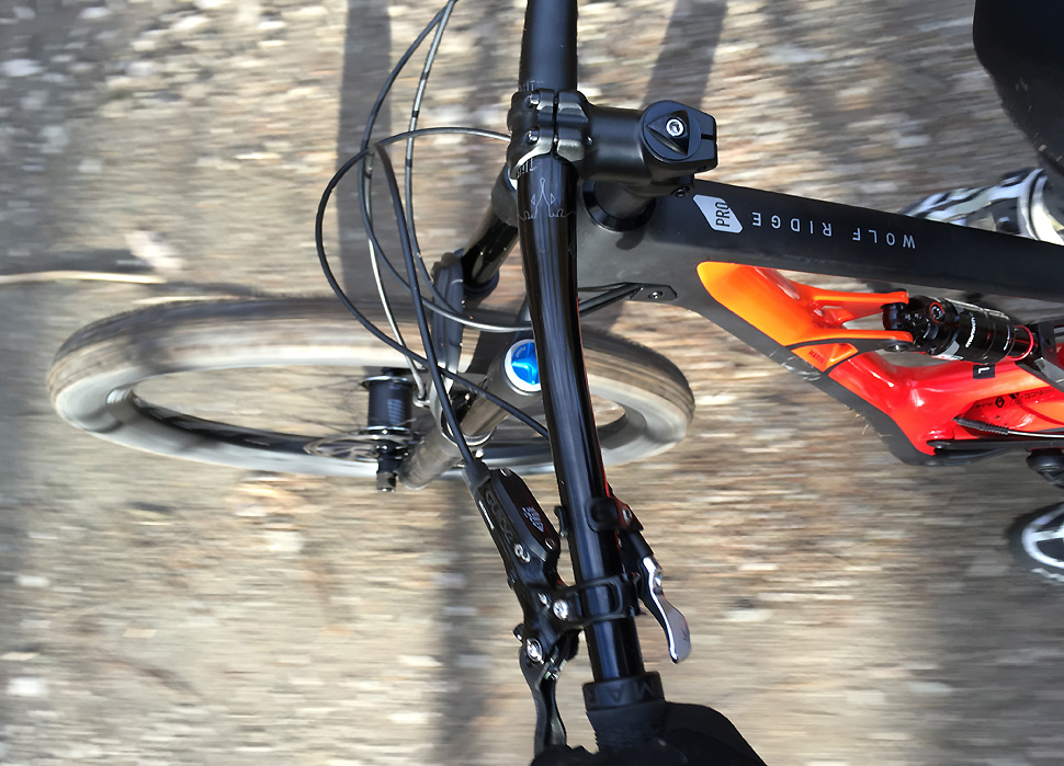 Rozdíly oproti sériovce ale nekončí ani tlumičem. Místo karbonových řídítek jsou zde hliníkové 780 mm široké vlaštovky, sympatické ale svým parciálním lakováním/matováním. Naopak co se oproti specifikaci nezměnilo, jsou "brutální" zapletená kola e*thirteen TRS Race Carbon v celé své kráse i šířce, obutá do gum WTB Vigilante 29x2,3".