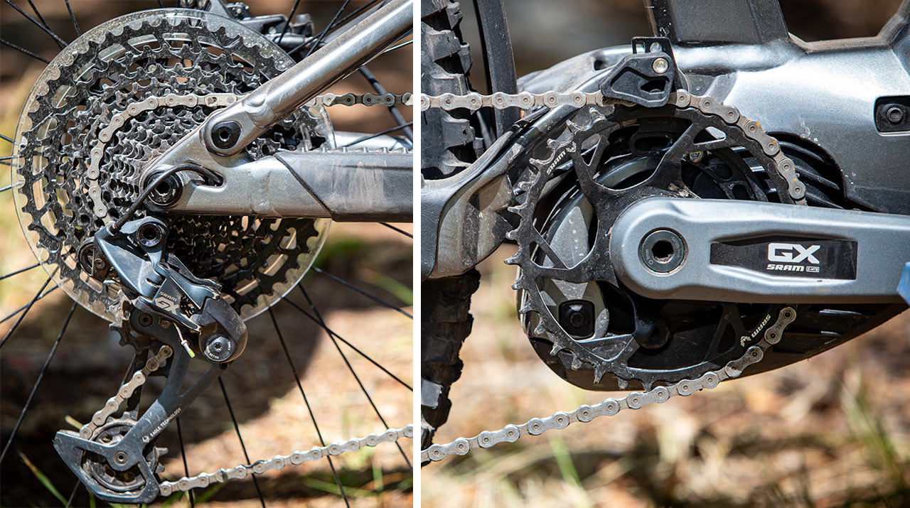 Na jedné straně pomáhá lepit celé kolo k zemi, na straně druhé ale kombinace nižšího středu a klik dlouhých 165 mm přináší mnohdy až nepříjemně časté kontakty se zemí. Osobně bych proto popřemýšlel o nahrazení klik za kratší kus a nebál bych se jít klidně až na mezní rozměr 150 mm, který dnes najdete třeba i v sadě SRAM Eagle 90 (viz Mechanické sady SRAM T-Type), ať zůstaneme u stejného výrobce.