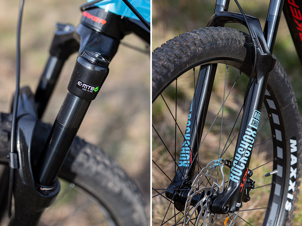 Hned po vybalení z krabice jsem se zájmem okukoval také vidlici. Výrobci totiž většinou používají na podobné modely známější, ale horší verzi Recon, zatímco Judy je o poznání lehčí, díky hliníkovým vnitřním nohám a také, alespoň za mě, má oproti Reconu mechovější hod. Co chtěl výrobce naznačit nálepkou E-MTB se jen dohaduji, zřejmě to má souvislost s informací doporučující do ní fouknout o 10 PSI víc než když není na elektrokole.