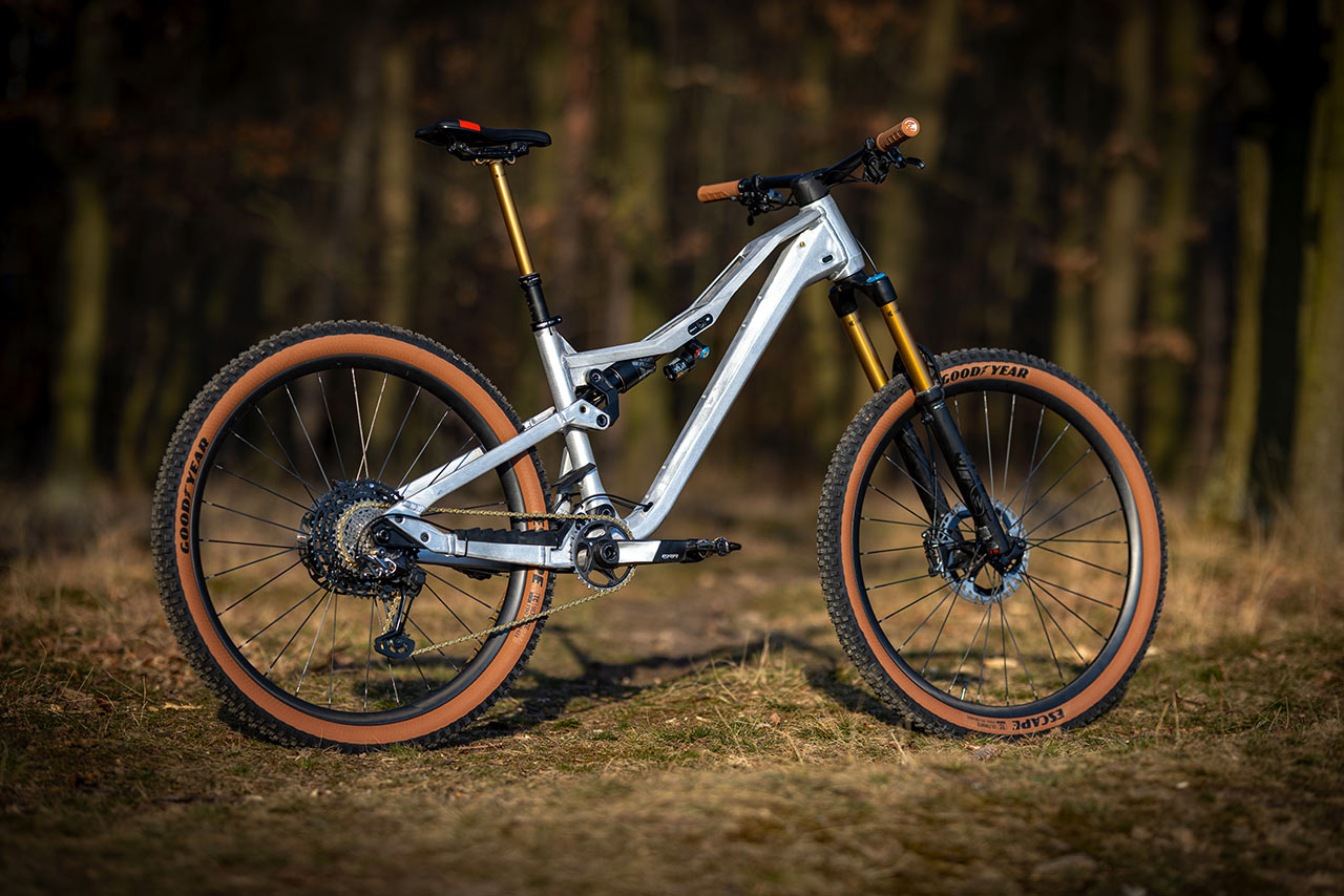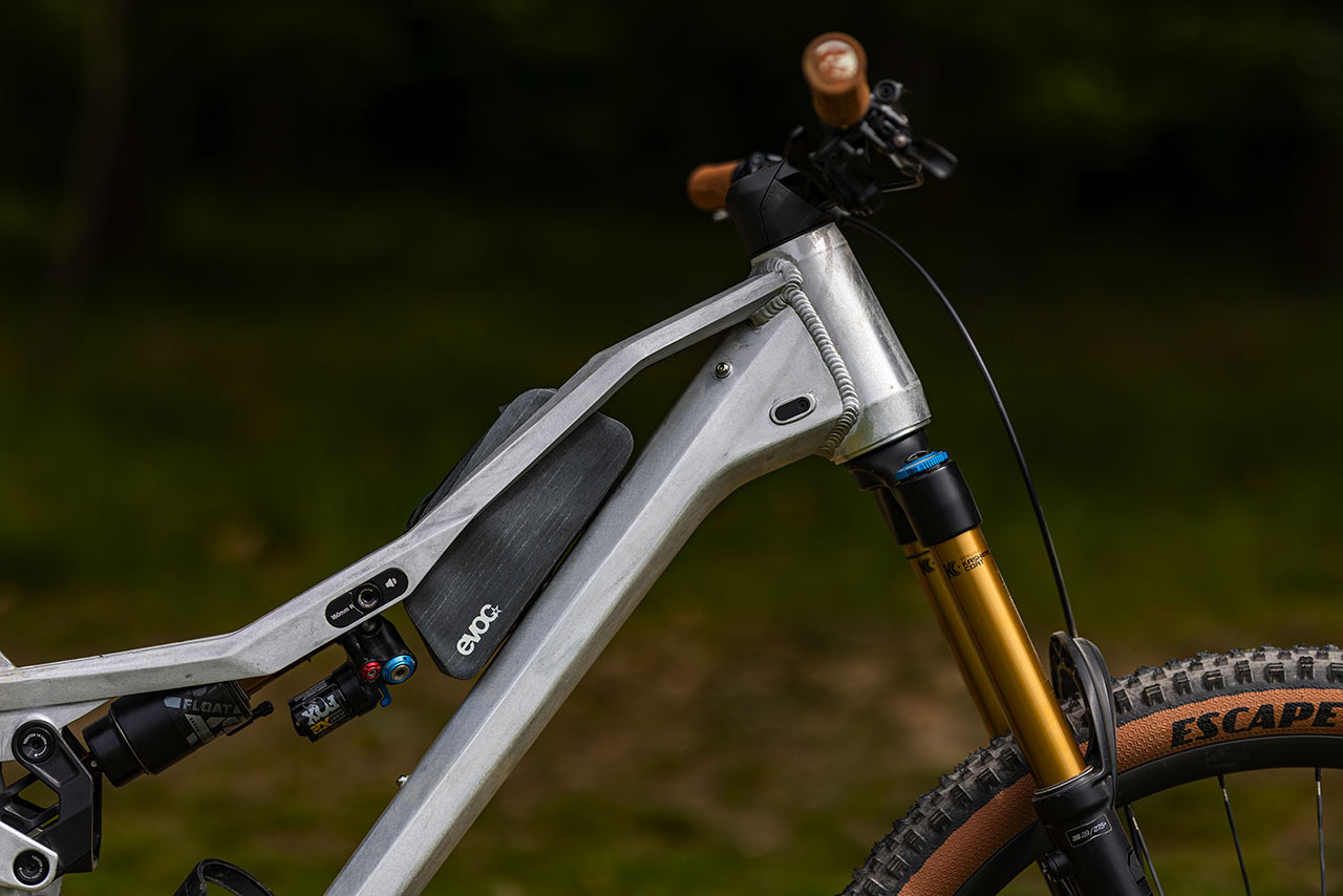 Ale nejprve začnu celkovým dojmem. Oproti sériovému modelu působí syrový hliník v kombinaci s Factory komponenty od Foxu už na první pohled výrazně lehčím dojmem. Jasně, stále se bavíme o poměrně robustním rámu, jehož hmotnost zůstala víceméně stejná, ale první potěžkání překvapí – kolo působí mnohem lehčím dojmem, než byste čekali podle vizuální masy rámu.