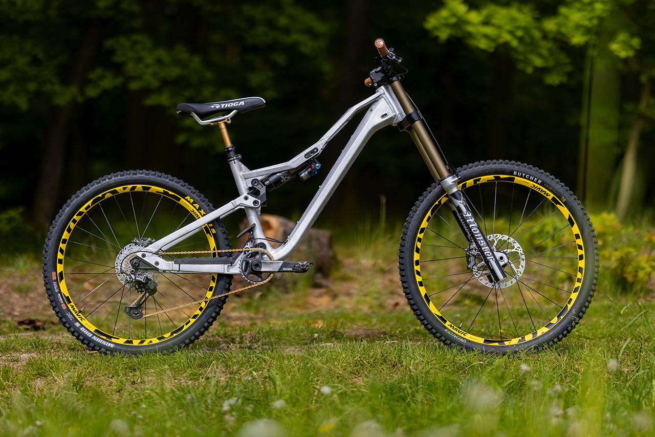 A protože co je sjezdové kolo bez mullet kombinace kol, rozhodl jsem se osadit nový zapletený sjezdový set – konkrétně žlutou sadu Mavic DeeMax DH, která stylově navazuje na ikonické výplety z přelomu tisíciletí a její žlutý lak překvapivě dobře sedí k surovému hliníku tohoto biku.