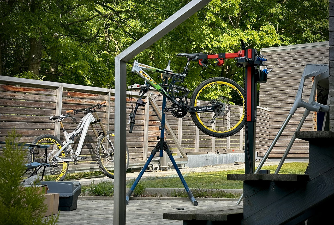 Celkově zůstává bike hezky vyvážený. Když ho zavěsíte ve stojanu za přední úchyt tlumiče, tedy v místě přibližného těžiště, visí jako podle pravítka.