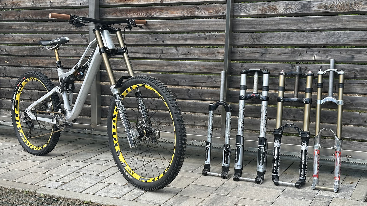 Netrvalo dlouho a začal jsem shánět komponenty pro další stavbu – a vyústilo to v docela šílenou kombinaci moderního rámu s legendární sjezdovou vidlicí Marzocchi Monster. Tu jsem musel sundat z jednoho ze svých retro kol, ale uznejte sami – stálo to za to.