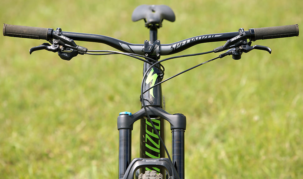 Jelikož je řeč o nejlevnějším karbonovém modelu, musíme konstatovat, že komponenty kokpitu i sedací části jsou komplet hliníkové. Vpředu tak najdeme 780 mm široké vlaštovky usazené v hliníkovém trailovém představci. Vzadu pak regulaci výšky posedu obsluhuje sedlovka X-Fusion Manic se zdvihem 150 mm doplněná o novou spodní páčku SRL LE od Specialized. Sedlo Body Geometry Phenom Comp je taktéž v základním provedení s CroMol ližinami.