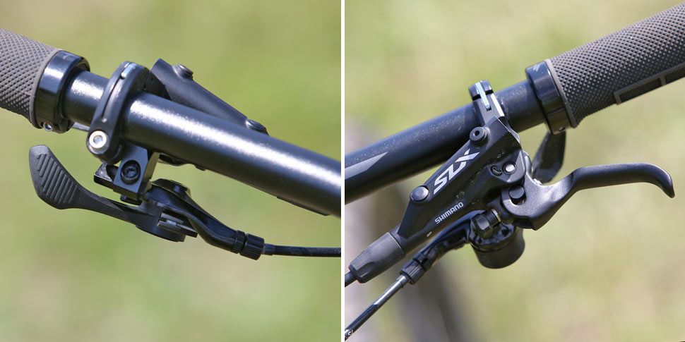 Osobně mám rád i jednoduchost a čistotu kokpitu a v té Specialized kraluje. Na řídítkách máte pouze dvě objímky brzdových pák a jak páčka řadící, tak páčka ovládající teleskopickou sedlovku jsou uchyceny přímo k brzdovým pákám, byť ta teleskopková k tomu potřebuje pro Shimano speciální adaptér. Bohužel tak jako potěší design, už nepotěší účinost brzd. Přeci jenom SLXo není úplně optimální pro bikeparkové celodenní ježdění a utavit ho mi nedalo zas tak moc práce. Pochválit musím ale pro změnu chod použité teleskopické sedlovky. Už žádná střelba, jak jsem byl v minulosti zvyklý u Specialized sedlovek, ale krásně tlumený chod. Pohled na sedlovku v zápětí ale prozrazuje důvod této změny. Ano, Specialized na tenhle model nedává vlastní sedlovky, ale X-Fusion Manic, který navíc ovládá prostřednictvím své vlastní nové ekonomické páčky, jejíž tělo je plastové s praktickým zdrsněním pro spolehlivý provoz i za mokra. Dějí se to u Spešlu věci, které byste nečekali...