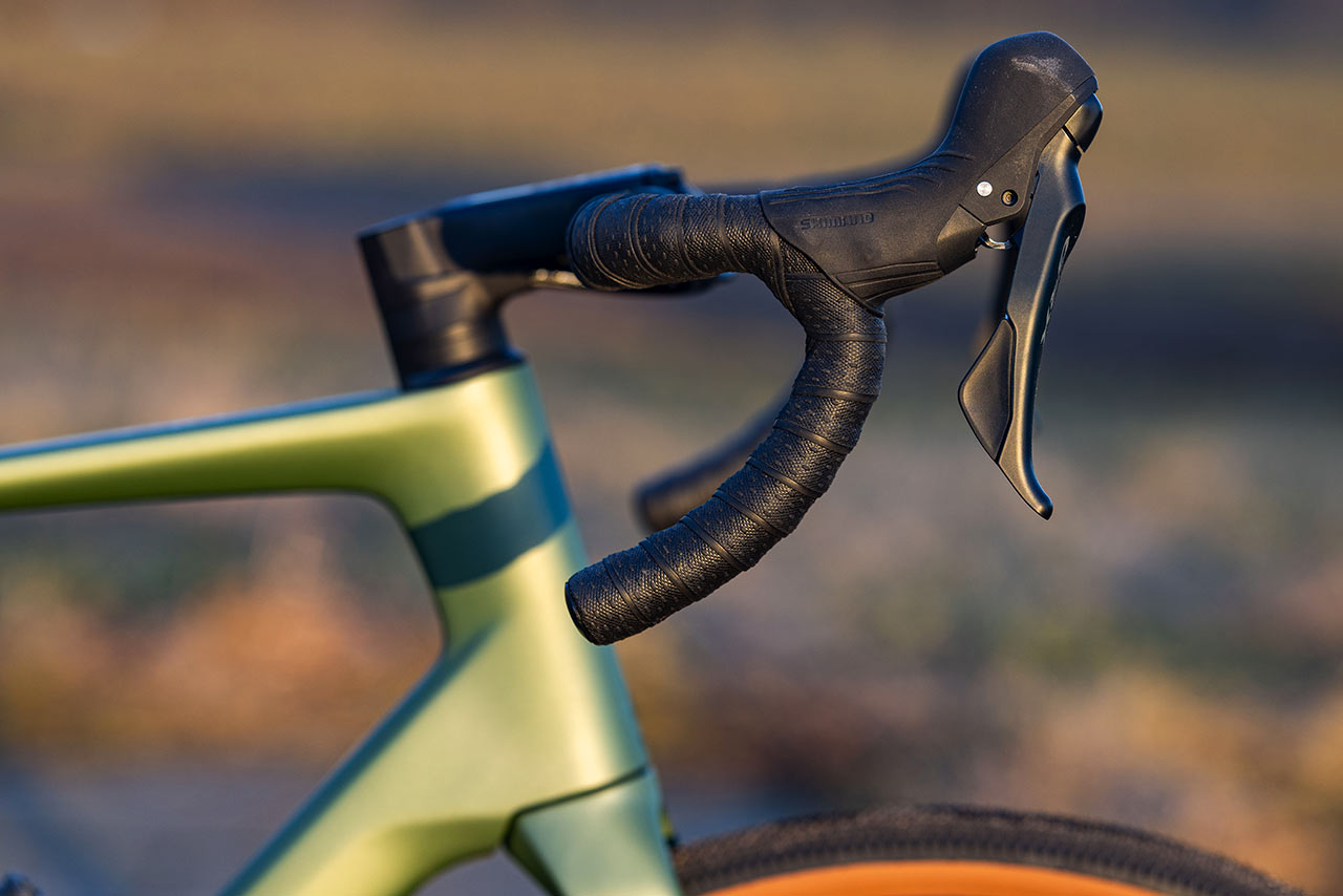 Co se týká kokpitu, tak ten je tady kompletně hliníkový. Nicméně nemá nijak výrazně gravelovou specifikaci, a to jak co se týká šířky, tak co do vyhnutí vnějších konců řídítek. Vlastní ONE Handlebar Tape omotávka je ale příjemná a je dotažená blízko představce. Takže přesto, že na kulatých řídítkách chybí výraznější ergonomická opěrka dlaní, jakou nabízí karbonový integrovaný kokpit, tady klasika bez problémů stačí a i horní úchop je pohodlný.