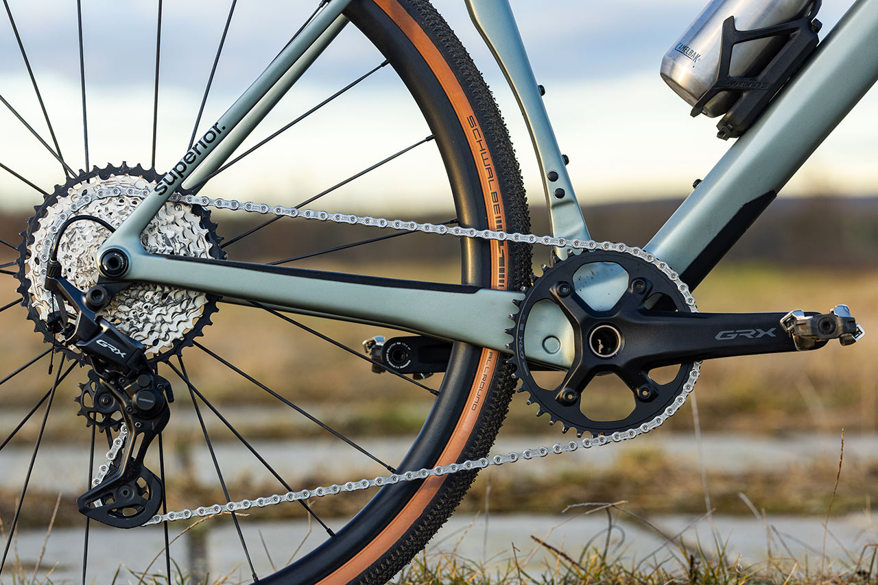 Pokud si řeknete, že máte před sebou základní karbonový model, asi nebudete překvapeni tím, že na něm najdete Shimano GRX. Tedy konkrétně jeho 1x12 verzi, která je poskládána z přehazovačky RX822, RX610 jednopřevodníkových klik s 40z převodníkem, kazety SLX CS-M7101 s rozsahem 10-45z a dualů RX610.