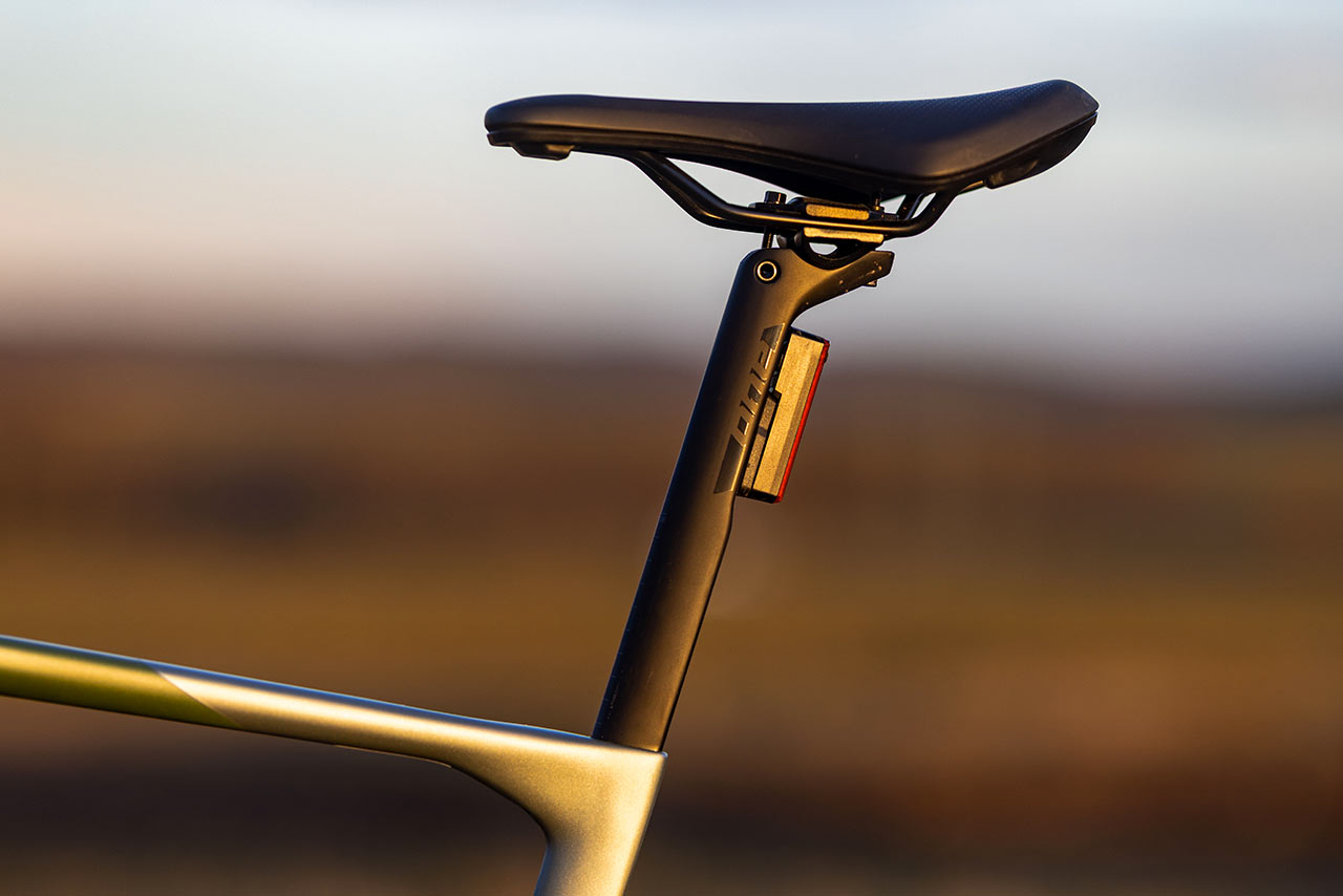 O sedlovce již řeč byla. Ta je tady karbonová a najdete na ní jak sériově dodávanou blikačku nabíjenou přes USB, tak Selle Royal SRX sedlo široké 148 mm.