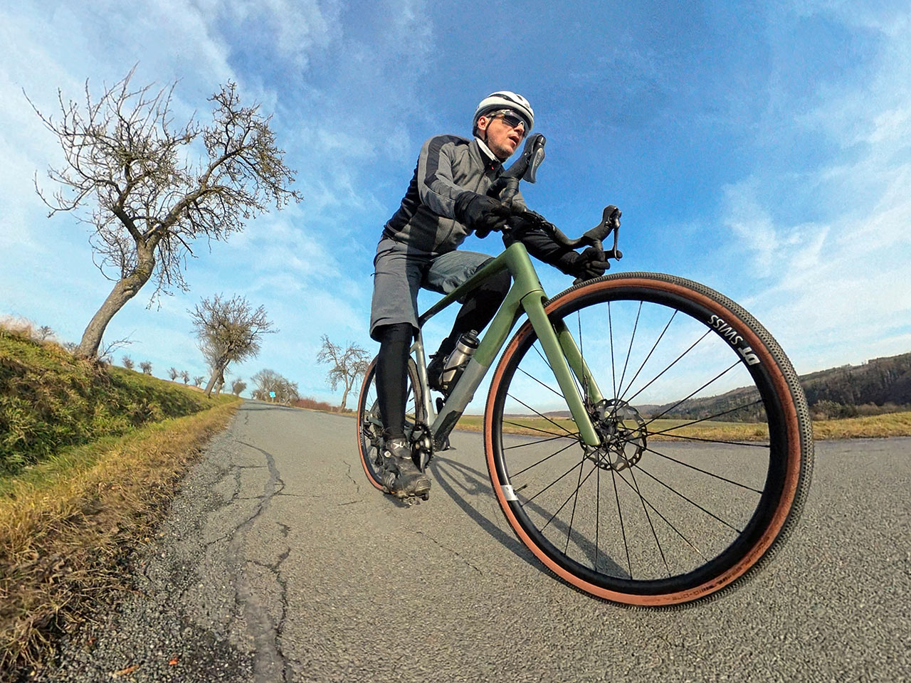 Silniční rám nepromíjí. Amatér si na rozbitých cestách musí vyhrát s tlakem v pláštích. My jsme naštěstí měli možnost jezdit rovnou na bezdušovém provedení. Tlak pod dva bary je ale jen pro fajnšmekry, protože pláště se začínají na asfaltových točkách žvýkat.