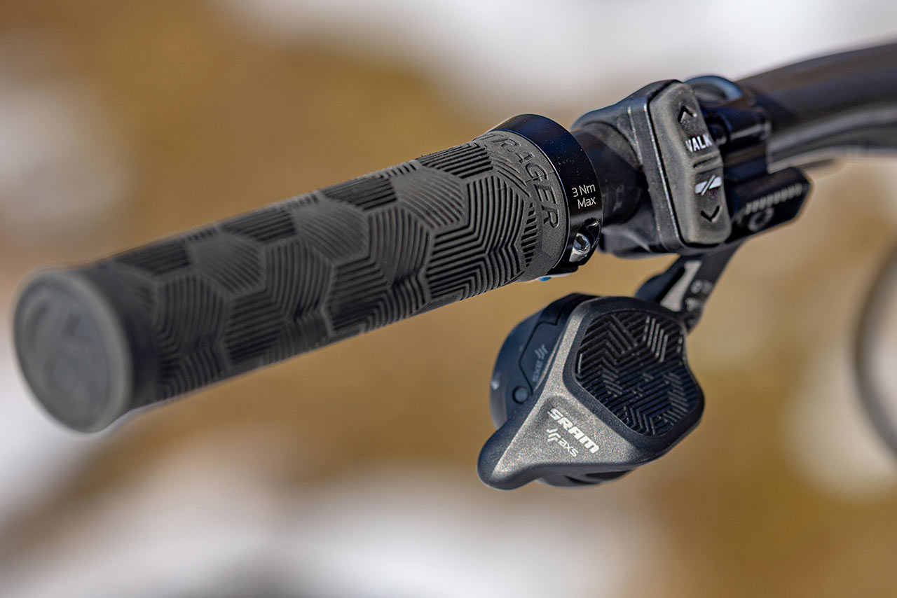 Řazení zde zajišťuje Sram X0 Eagle AXS v nejnovějším provedení T-Type. Z této sady tu najdete přehazovačku, kazetu, řetěz, řadicí páčku i kliky. Převodování je typicky „ebikové“ – vpředu dostanete 34zubový stříbrný jednopřevodník a vzadu pak klasickou 1×12 kazetu Sram XG-1295 s rozsahem 10–52 zubů.