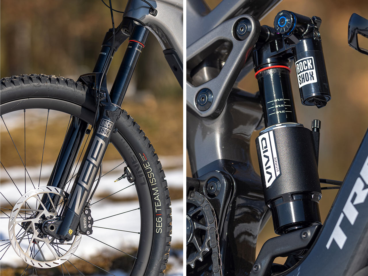 Co se týká odpružení i celkové výbavy, dominuje tu jednoznačně rám. Podvozek tvoří RockShox ZEB Ultimate odpružená vidlice s patronou Charger 3.1 RC2. Zadní tlumič je vzduchový RockShox Vivid Ultimate s roztečí 230x65 mm. V obou případech se bavíme o zdvizích rovných 170 mm.