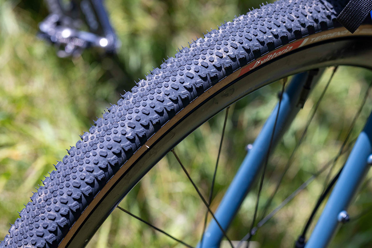 Vittoria Terreno T50 se pyšní dezénem s jemnějším vzorkem poskládaných ze šestiúhelníkových figur uprostřed běhounu, hrubším po stranách a výraznějšími bočními bloky pro jistotu v zatáčkách. Kompaktní střed s dobře čitelným vzorkem do V pomáhá nejen hladší jízdě na silnici, ale také stabilitě v terénu.