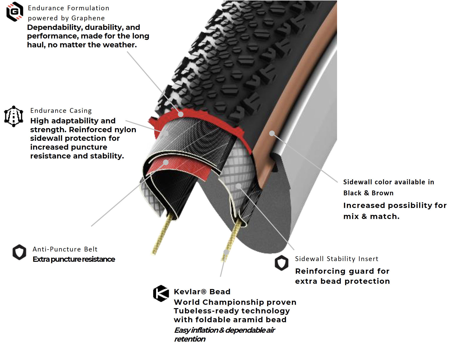 Vittoria tento gravelový plášť nabízí výhradně s kevlarovou skládací patkou a nylonovým kordem se 100 TPI. Co se týká směsi, je zde použita speciální směs s grafenem, která má zajistit nižší valivý odpor, vyšší přilnavost na mokru a současně také delší životnost. Plášť rovněž disponuje dalšími technologiemi, které chrání proti defektům, viz výše.
