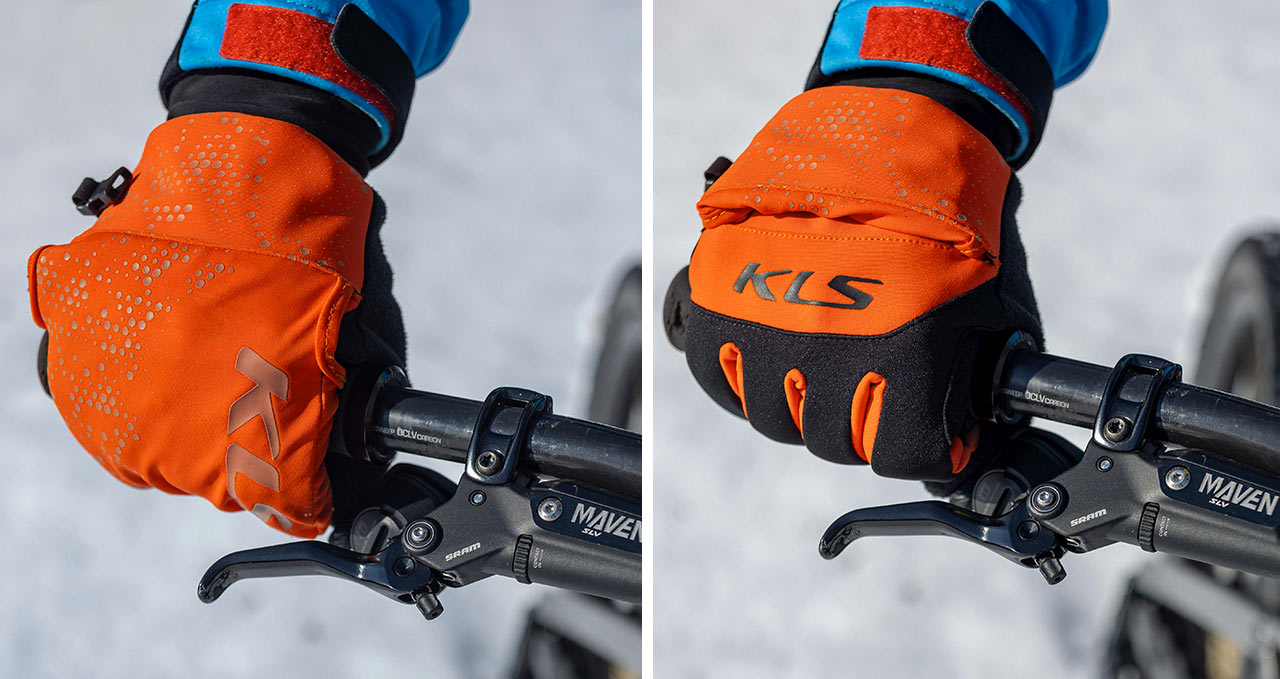 KLS Cape orange jsou nepřehlédnutelné rukavice, které však tak trochu klamou svým tělem, protože jsou to vlastně dvoje rukavice za cenu jedněch. Kellys je totiž v rámci svého online katalogu prezentuje jako klasické zimní dlouhoprsté rukavice, jenže ony v sobě ukrývají navíc ještě i volitelný neprofuk návlek, který si můžete buď schovat v neviditelné kapsičce, nebo ho vybalit a udělat z rukavic něco jako palčáky, které tím pádem získají ještě další vrstvu a tím pádem i větší odolnost proti chladu.