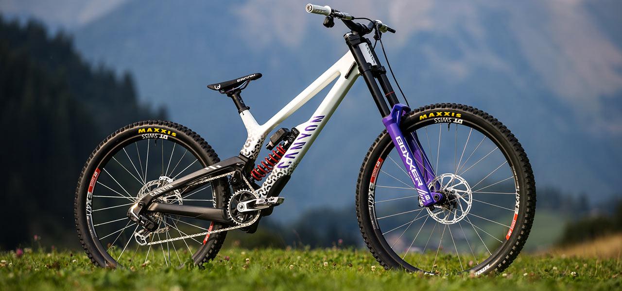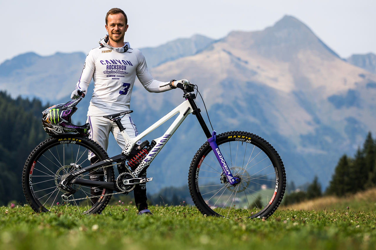 Obvykle Troy jezdí na černém modelu Canyon Sender CFR Team, ale tentokrát je jeho bike vyveden v netradiční kombinaci fialové, černé a bílé (chceteli světle béžové). Design vznikl přímo v továrním ateliéru Canyon, byl pečlivě ručně nalakován a sestaven těsně před prvním tréninkem ve francouzském Les Gets.
