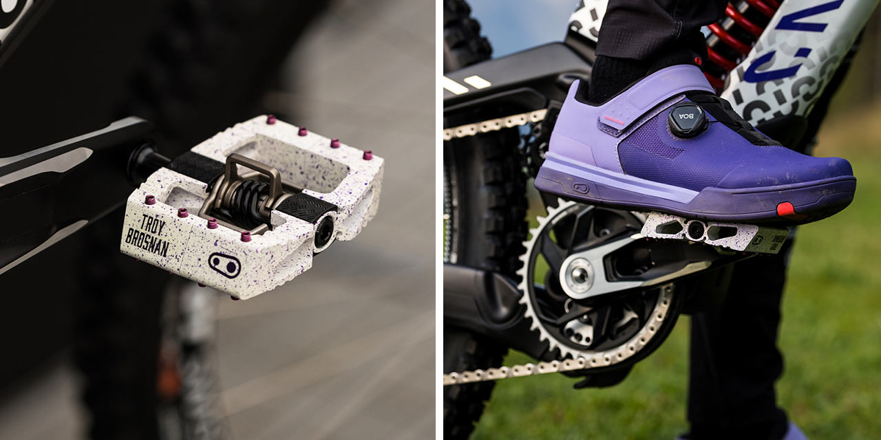 Custom barevnou kombinaci doplňují i jeho signature Crank Bros Mallet DH pedály, společně s fialovými botami od stejné značky a na fialovo je nalakována také vidlice RockShox Boxxer Ultimate s Flight Attendant technologií. Také celkové pojetí designu závodního dresu i kalhot v podání Troy Lee Designs Troyovi ladí s bikem.