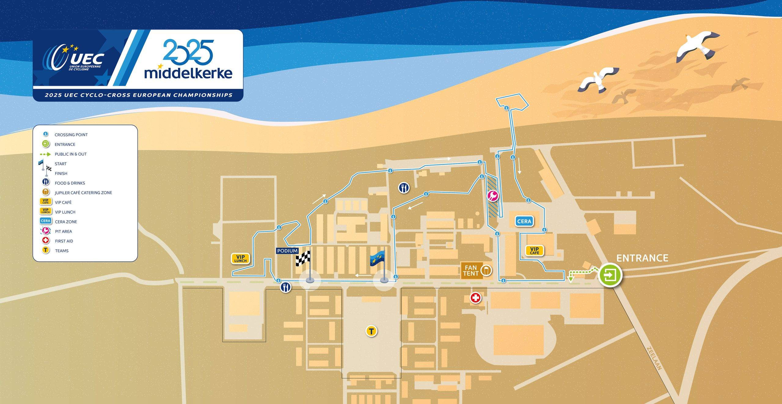 Jak Ježek naznačil, trať je z velké části na písku. Trať vede po pláži Severního moře ve vojenském areálu Lombardsijde, jenž poskytne jedinečné kulisy pro Mistrovství Evropy. Za běžných okolností je tento prostor veřejnosti uzavřen, tentokrát však na jeden víkend otevře své brány pro špičkové cyklokrosové představení.